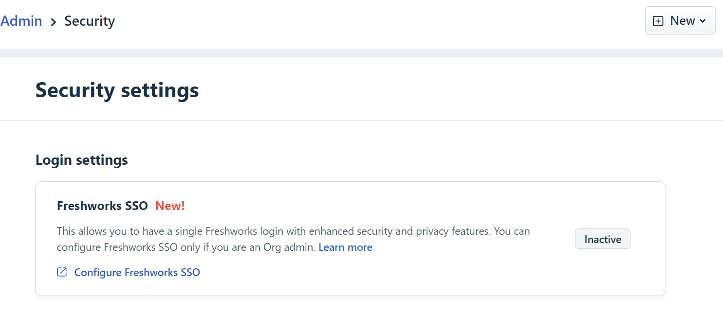 If you are going to set up SSO in the account for the first time, then you can directly configure it on the Freshworks Neo Admin Center. A message will be displayed under Admin>Security settings page prompting you to configure as shown below :