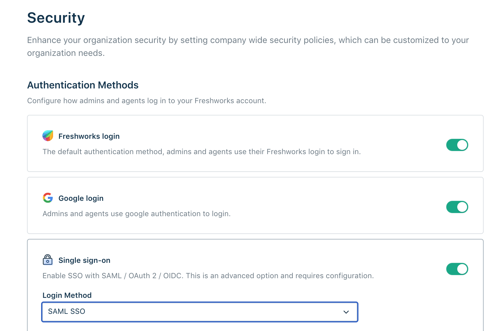As of today, Freshworks supports the following protocols to exchange user identity information securely between the Identity Provider and Service Provider. We have provided a detailed guide for configuring Single Sign-On settings for each of these protocols here.