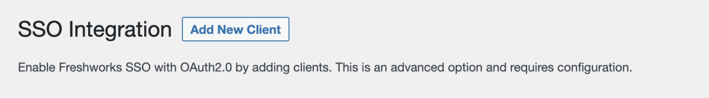 - Select SSO Integration. You'll be able to see options to enable Freshworks SSO with OAuth2.0 by adding clients. Click on Add New Client.