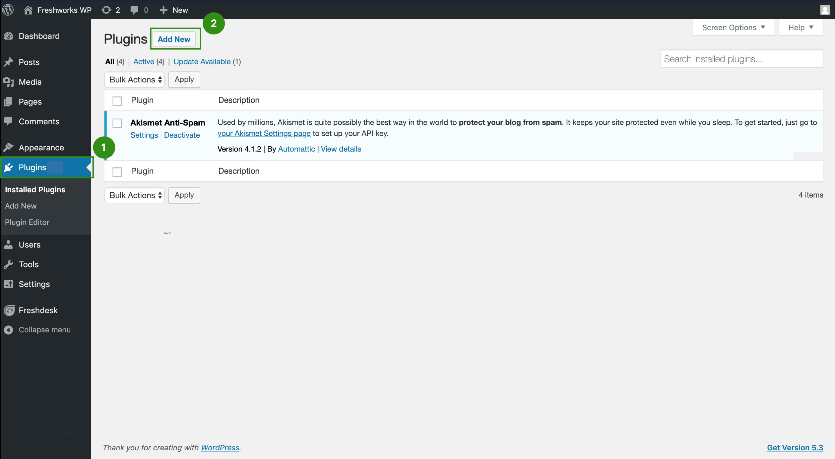 - Once you've installed the plugins, click Installed plugins (1). Click Activate (2) next to the Freshdesk (official).