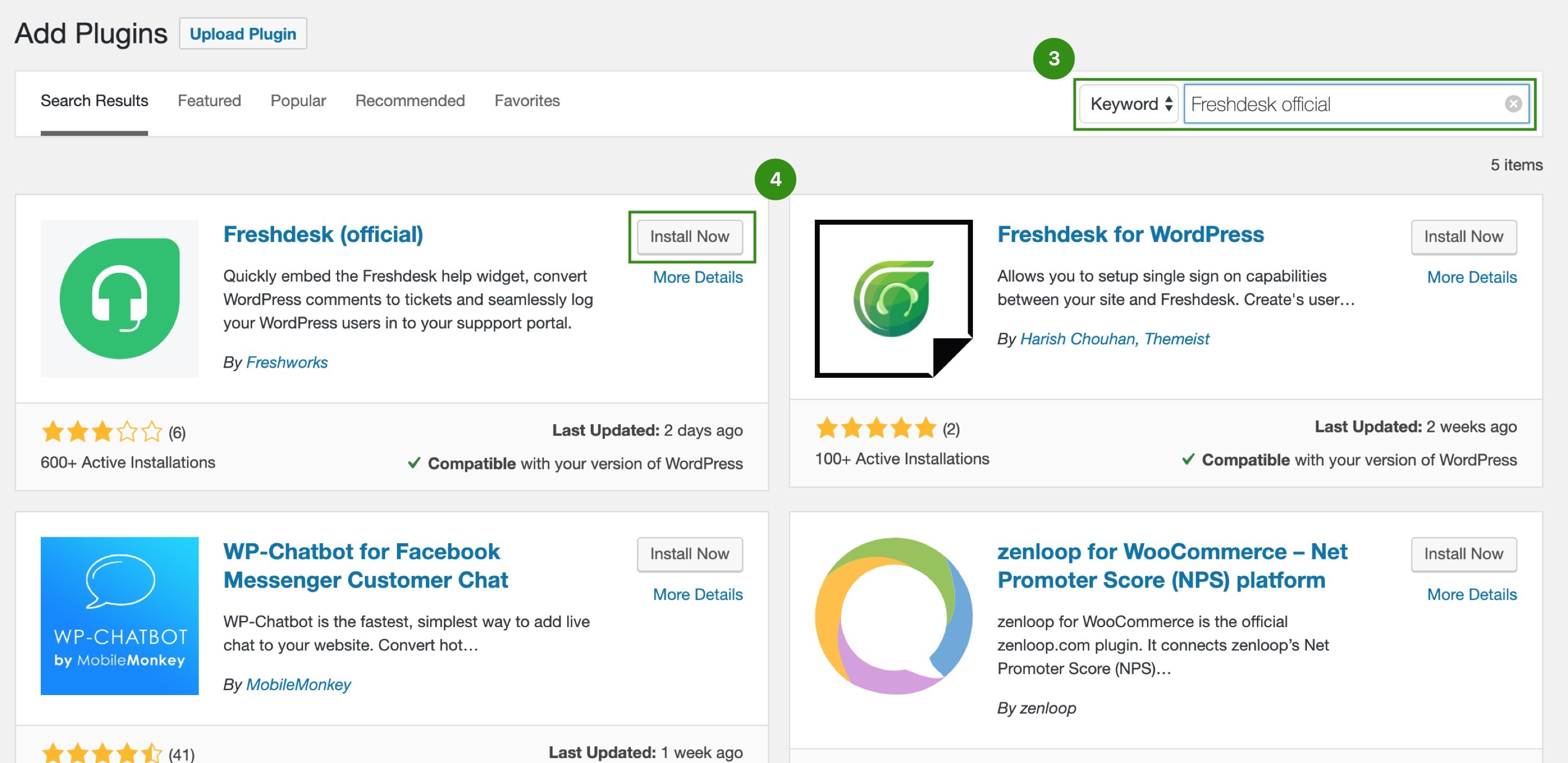 - Click Install now (4) on the Freshdesk (official) plugin.